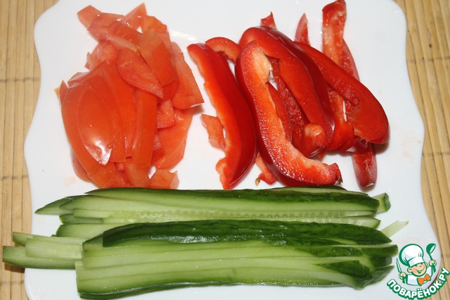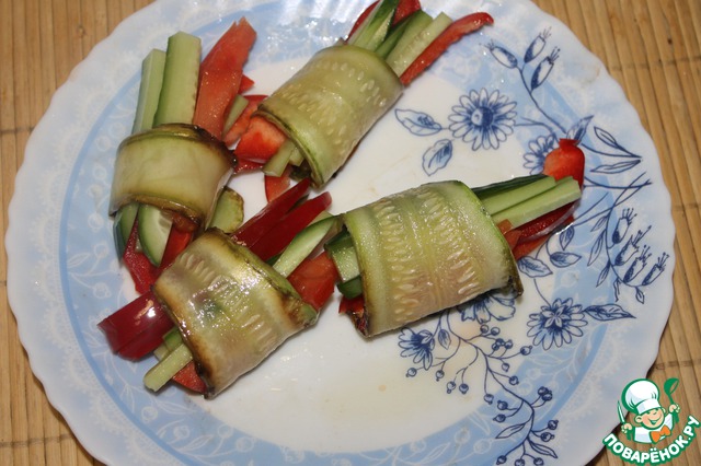 Заворачиваем полосочки из овощей в пластинки обжаренного цуккини и завязываем перышком зеленого лука