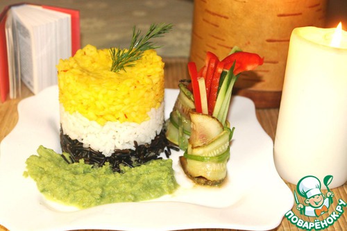 Рис выкладываем в сервировочное кольцо слоями, рядом ставим рулетики из овощей, рядышком поливаем соусом из стручковой фасоли и зовем к столу домочадцев
