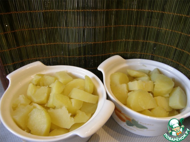Предварительно отварить картофель в подсоленной воде до готовности, лук порезать крупными полу-кольцами.