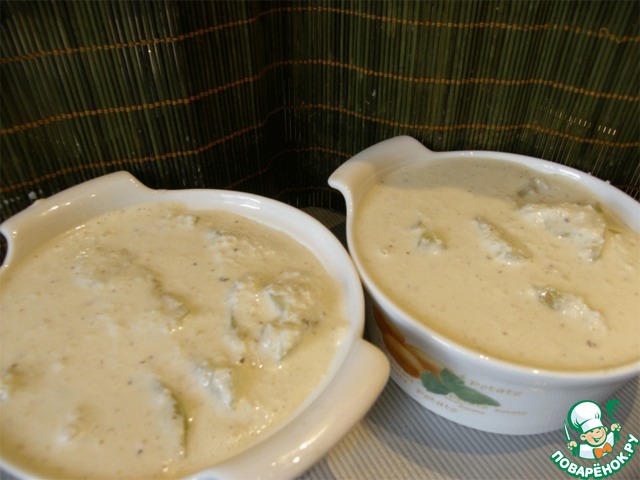 Приготовить заливку. Выложить обжаренные лук и чеснок в емкость для взбивания, добавить сметану, сливки и плавленный сливочный сыр. Все взбить блендером до однородной массы. После этого досолить и поперчить по вкусу.
