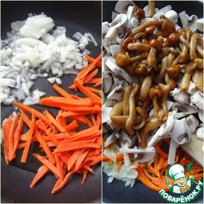 Параллельно делаем зажарку на растительном масле: на разную сторону сковороды укладываем измельчённые лук и морковь. Тем временем режем грибы (у меня свежие шампиньоны и замороженные опята), перемешиваем лук и морковь, добавляем грибы, обжариваем.