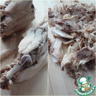 Из готового бульона вынимаем куриные части, сниманем с них мясо, отправляем обратно в бульон.