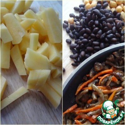 Фасоль и нут замочить с вечера, с утра сварить. На фото видно (я надеюсь на это))), что бобовые (нут и фасоль) ТМ Мистраль. Вообще, не принципиально, какая фасоль, но хочется дополнительных оттенков в супе, поэтому я взяла чёрную.