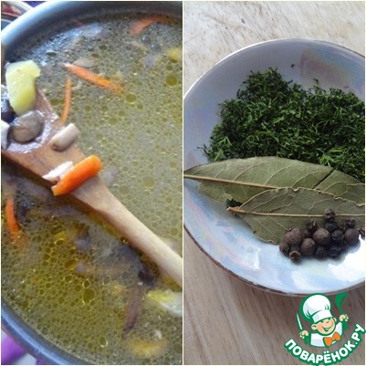 Дать закипеть, посолить, добавить зелень (у меня сушёные петрушка и укроп), горошины перца, лавровый лист. Томить суп на медленном огне 30 мин. Дать настояться.