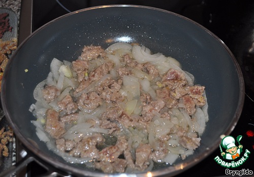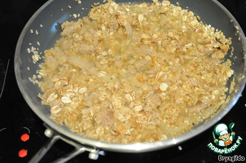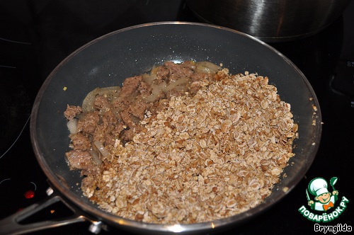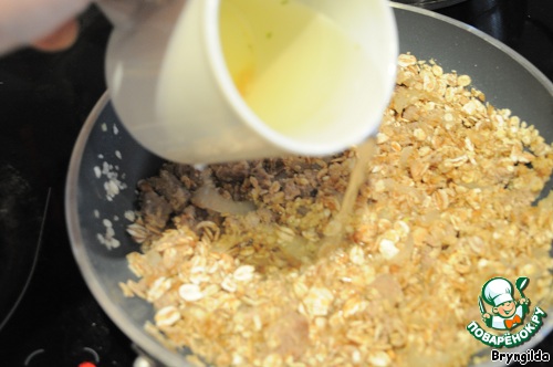 Добавить хлопья. Когда фарш будет почти готов, немного обжарить