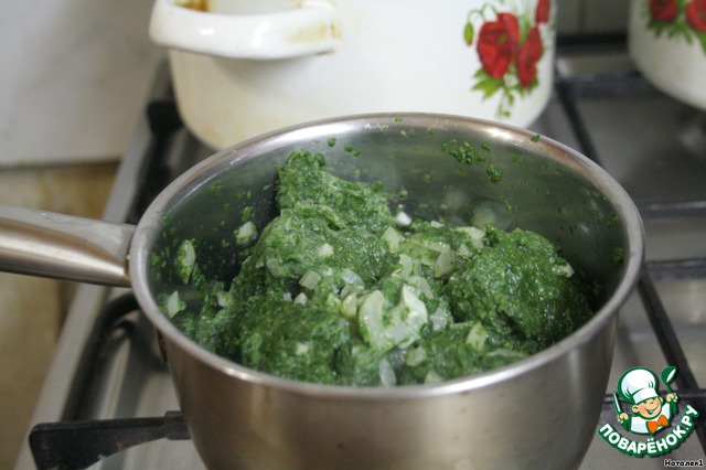 Размельченный шпинат отправить тушиться к луку и чесноку минут на 10-15 ( сначала до полной разморозки и еще плюс чтобы слегка покипел минуты 3-5). Солим, перчим.