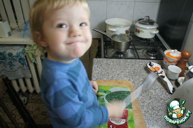Если шпинат замороженный, надо разломать его на кусочки. Я доверила этот процесс сынуле, он был в восторге :-D У него в руках кухонный молоточек :)