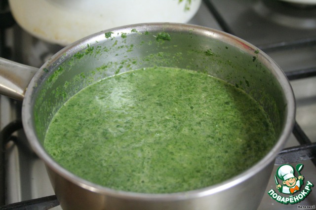 Если шпинат используете свежий или замороженный, но в листьях, на этом этапе его нужно измельчить в блендере до состояния крема. Добавить сливки и, если хотите, приправу типа Крошка пучок :-) и еще минутку под крышкой подержать.