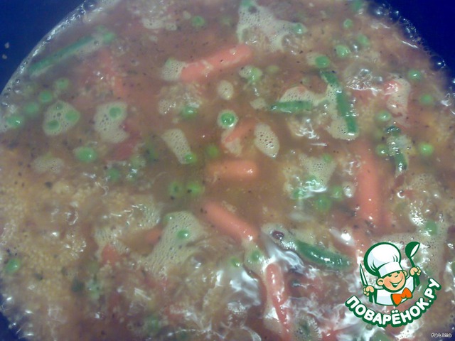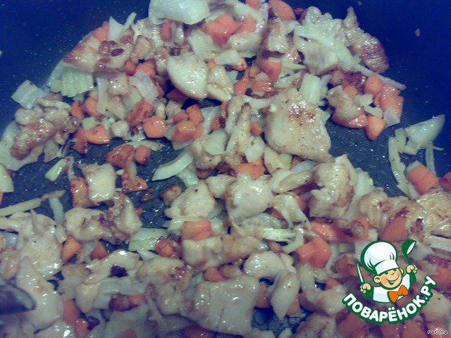 Затем замороженные овощи, перемешать и жарить при прикрытой крышке