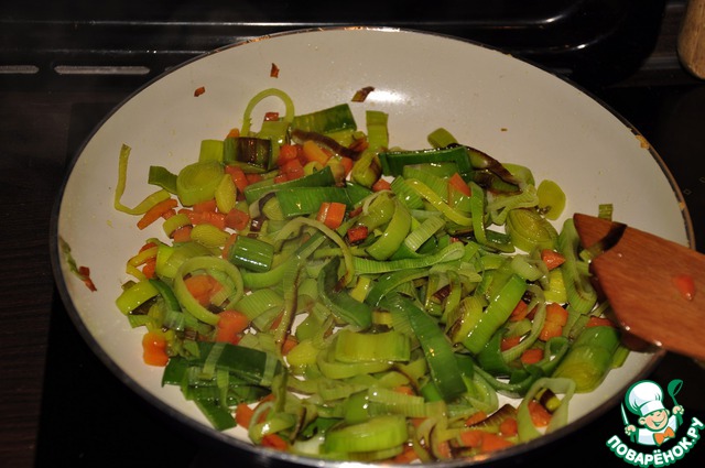 Лук-порей порезать кольцами, если простой - то кубиками, нарезать морковку (можно потереть на крупной терке), спассeровать в масле.