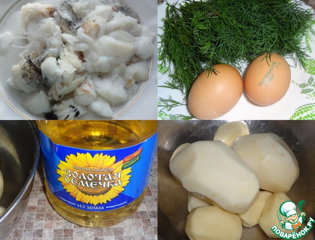 Отварить рыбу, остудить и освободить от косточек. Почистить картошку, залить водой. Порезать мелко укроп. Приготовить яйца, сметану и растительное масло.