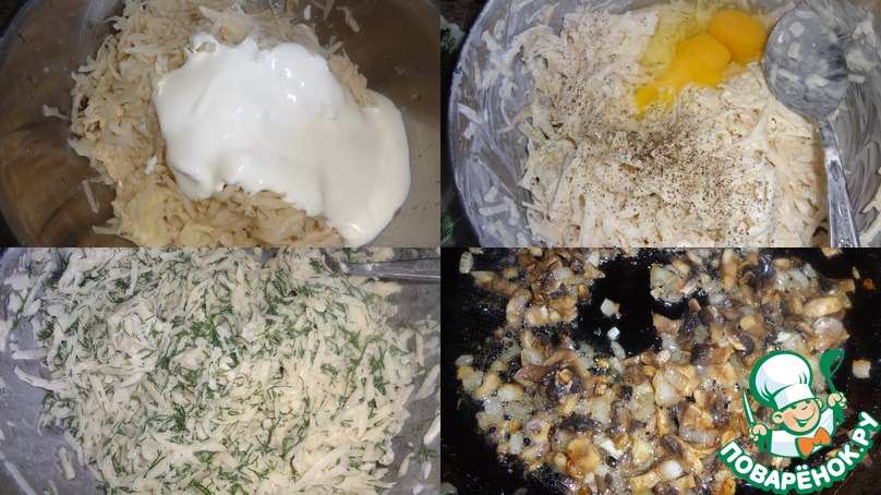 Поджарьте на раст. масле репчатый лук и грибы. Добавьте туда 2 ст. л. сметаны, 1 ст. л. муки. Разведите кипячёной водой и немного потушите до загустения. Соус можно пробить в блендере, а можно и так подавать.