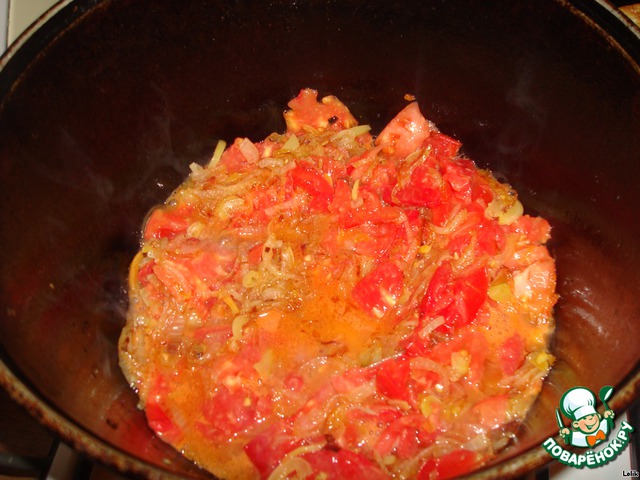 Нарезаем помидоры дольками и кладем в казан, мешаем в казане на сильном огне и чуть-чуть присаливаем, чтобы было немного недосоленым, чтобы в конце можно было полить соей. Кто любит болгарский перец, то его тоже можно положить.