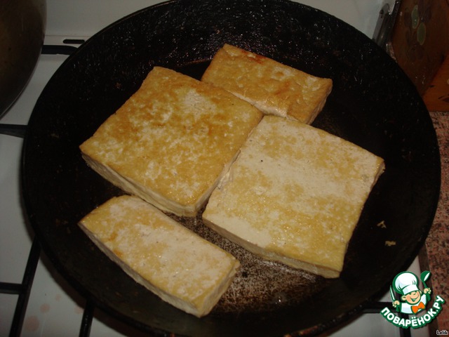Обжариваем тофу на сковороде,чтобы чуть корочкой покрылся и при тушении, в дальнейшем, в казане не разваливался. Можно и не жарить, а сразу в казан класть. После обжарки Тофу режем брусочками.