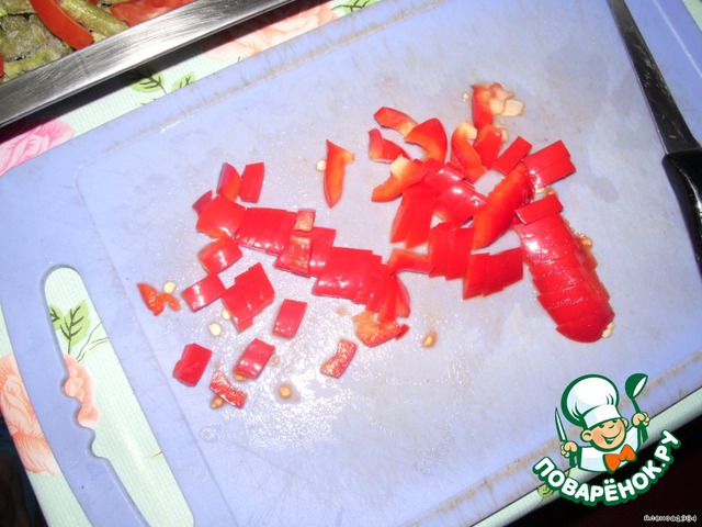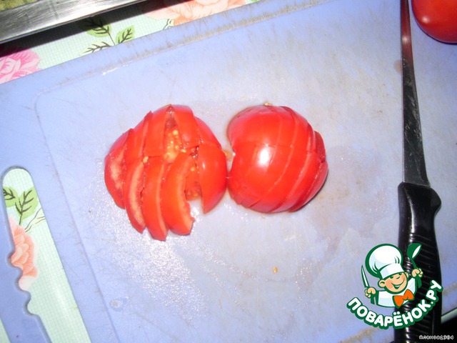 Режем болгарский перец (я взела половину перца) и выкладываем поверх помидор.
