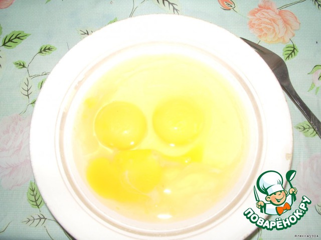 Разбиваем три яйца в тарелку.