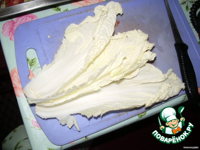 Берем листья салата режем средней соломкой.