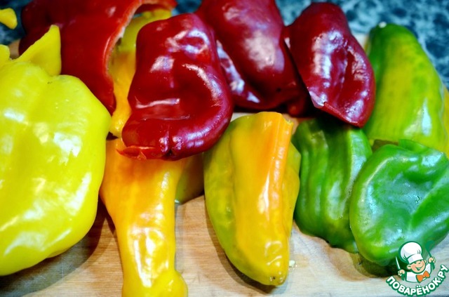 Разрежьте все перцы на четвертинки, удалите плодоножки с сердцевиной.