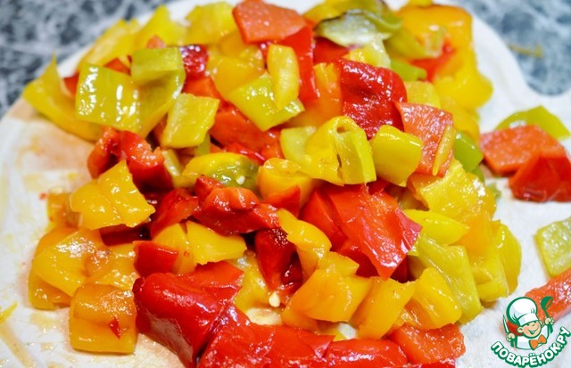 Сложите горячие перцы в миску, затяните пленкой и оставьте на 10 мин., затем удалите кожицу. Нарежьте перцы кусочками по 1,5 см.