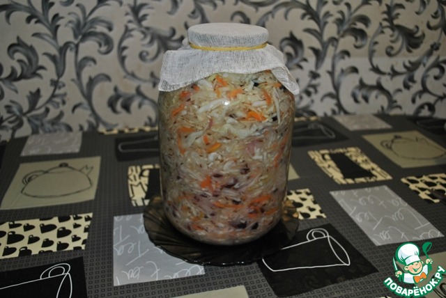 Банку накрыть марлей, поставить на тарелку и оставить в комнате на 3 дня. За это время капуста "потечет" (потому банка на тарелке).