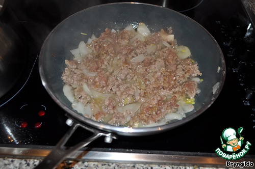 Теперь займемся начинкой. Обжарим на сковороде лук, добавим фарш,