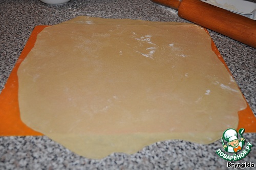 Форму смажем маслом и тонко, очень тонко, у меня тесто просвечивало, раскатаем тесто.