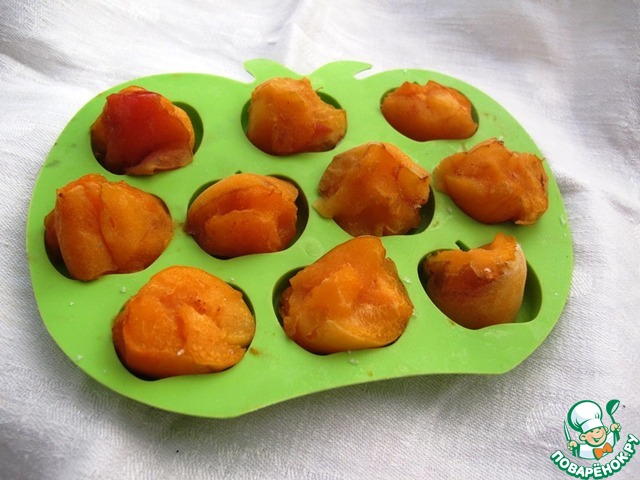 Вынуть косточку из абрикосов, положить в мисочку, посыпать сахаром и спрыснуть ароматизатором. Перемешать. Выложить в формочку для льда и поставить в морозилку. Этот шаг позволяет легче сформовать кнедлики и не дать начинке вытечь раньше времени. Обычно я это делаю накануне.