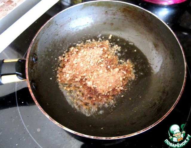 На сковороде растопить масло. Панировочные сухари смешать с какао и слегка обжарить в масле на сковороде.