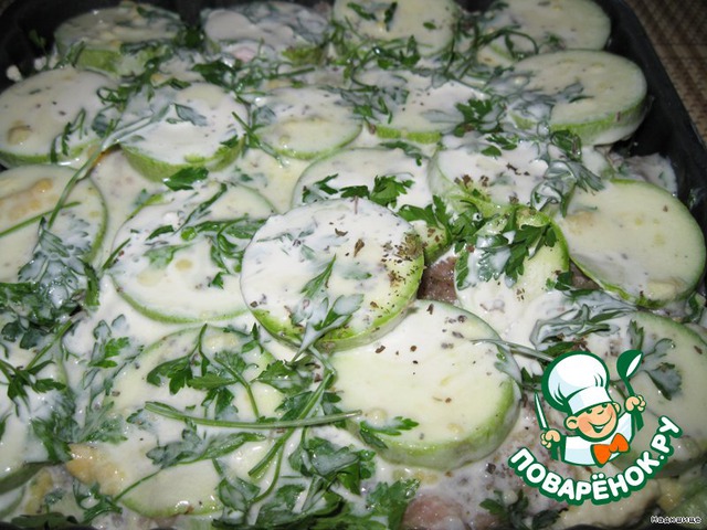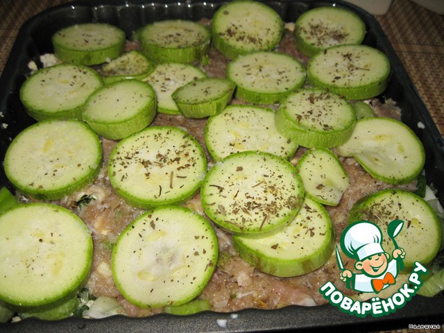 Режем тонкими кольцами кабачок и кладем поверх фарша.