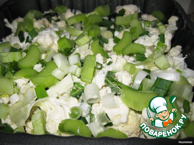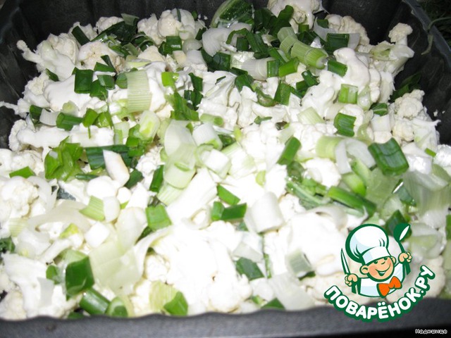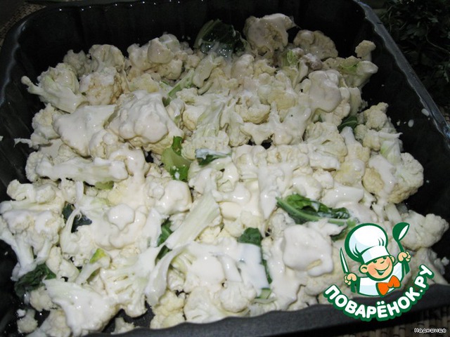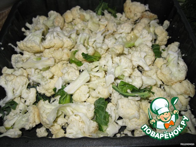 Кладем первый слой - разделенную на соцветия цветную капустку.