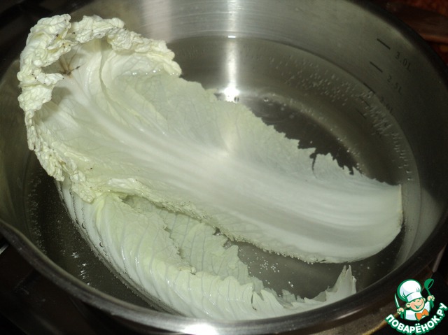 Китайскую капусту разбираем на листья и отвариваем в кипящей подсоленной воде 10-15 минут. Выкладываем в тарелку, даём остыть. Твёрдую часть листа слегка отбиваем.