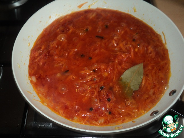 Немного обжарив, добавляем водички и специи. Доводим до вкуса: солим, добавляем сахар.