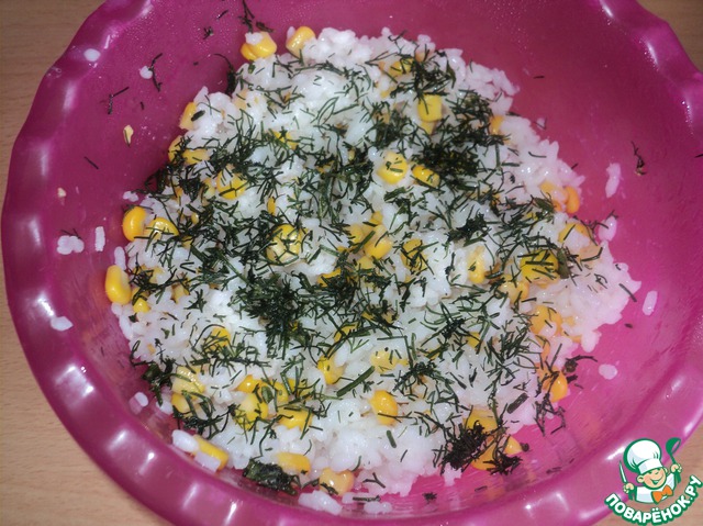 Отварной рис смешиваем с кукурузой (можно добавить зелень).
