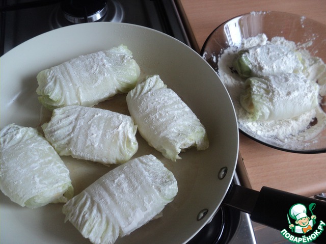 На широкую часть листа выкладываем начинку, заворачиваем, панируем в муке и обжариваем на растительном масле до румяной корочки.