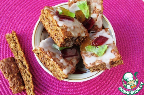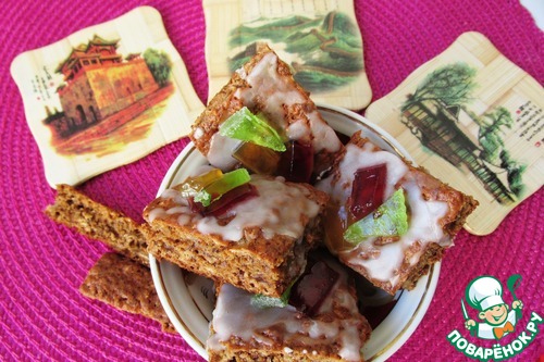 Сахарную пудру залить чайной ложкой воды и перемешать до гладкой жидкой массы, - это глазурь. Полить печенье глазурью, украсить кусочками мармелада, кураги или цукатами.