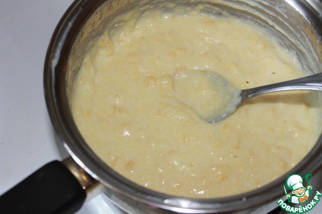 Сначала я сварила поленту: молоко вскипятила и тонкой струйкой всыпала кукурузную муку и поварила, помешивая, 5 минут