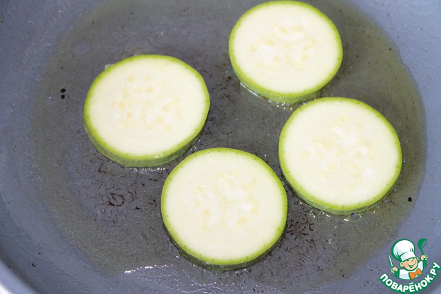 Цуккини нарезала колечками, посолила, поперчила и обжарила на оливковом масле