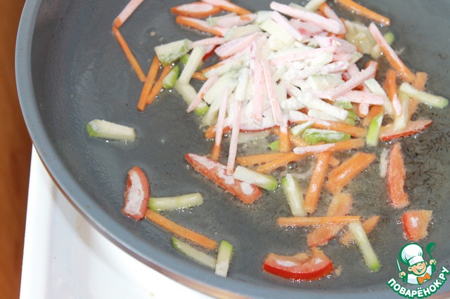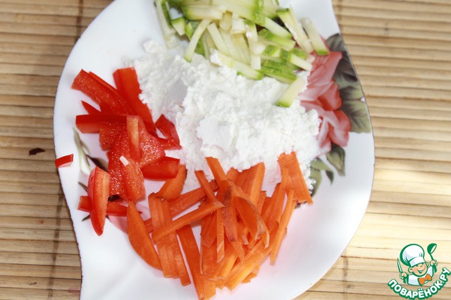 Для украшения сделала овощную вермишель: тонко нарезала морковь, болгарский перец, цуккини,