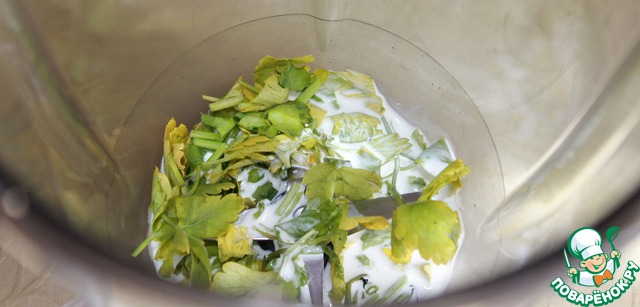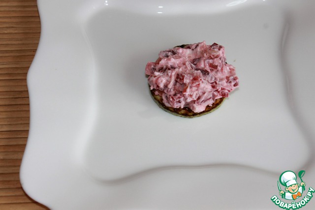 Для соуса взбила в блендере кинзу и сливки, посолила, поперчила и смазала верхний слой мильфея и чуть покапала на блюдо