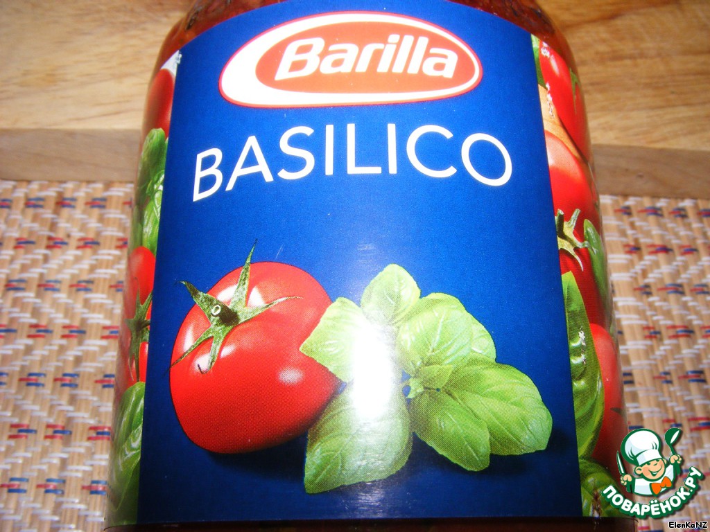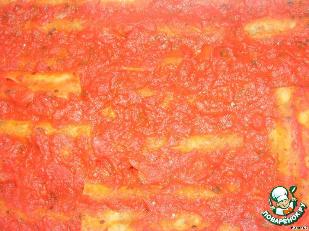 Фаршируем каннеллони начинкой и укладываем на противень. Заливаем томатным соусом. У меня соус с базиликом.