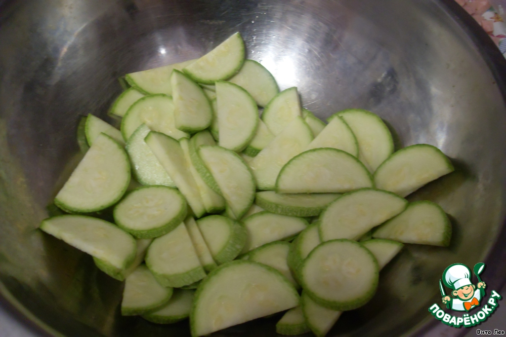 Все готовится предельно быстро и просто. Режем кабачки тонкими кружочками. Если кружочки большие, разрезаем пополам.