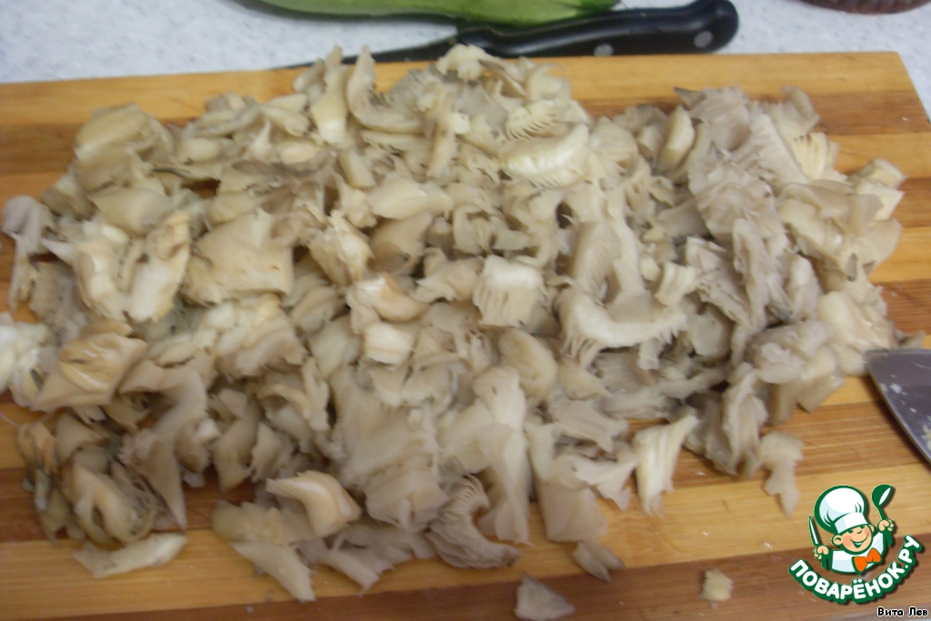 Шампиньоны нарезаем пластинками. У меня были вешенки, поэтому нарезка произвольная. Слегка обжариваем на сковороде, солим, перчим.