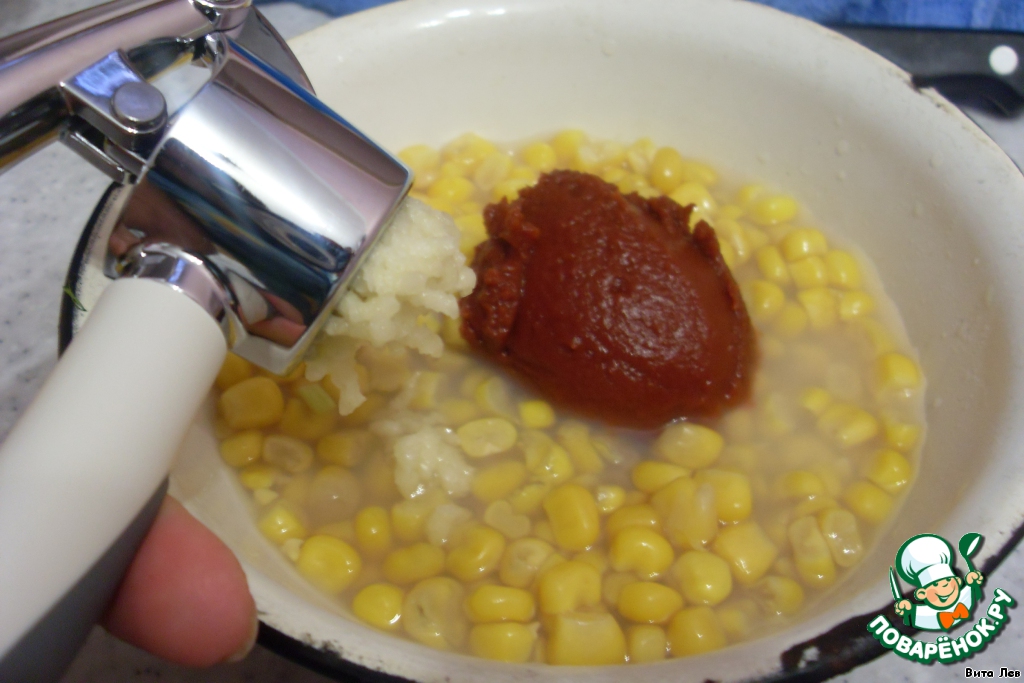 Консервированную кукурузу вместе с жидкостью смешиваем с томатной пастой, солим. Я еще добавила измельченный зубчик чеснока.
