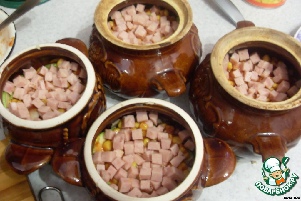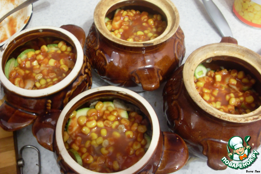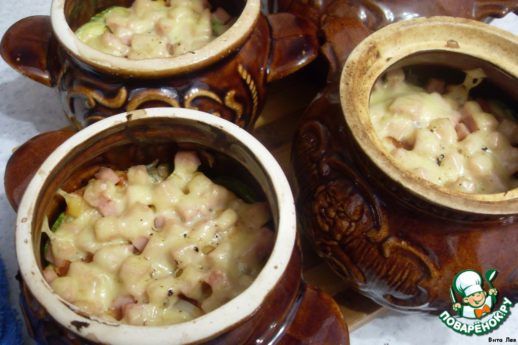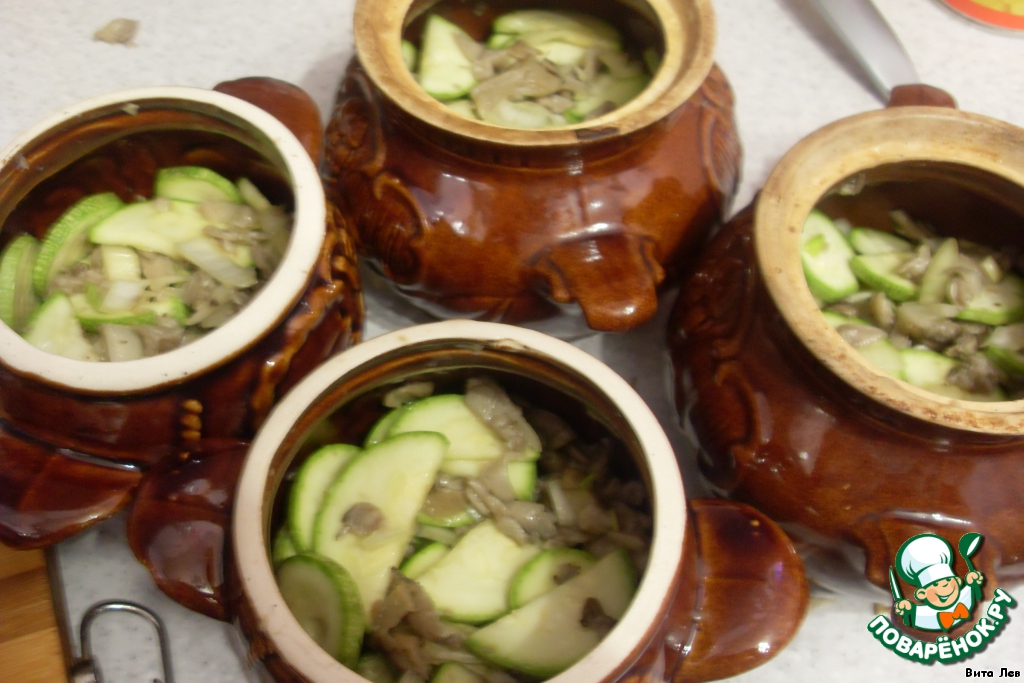 Кабачки смешиваем с грибами и луком, выкладываем в горшочки.