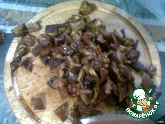 Баклажаны (я брала сушеные, предварительно отмоченные в течение ночи в воде, можно заменить грибами) нарезать на кусочки, подержать в соевом соусе минут 10-15. Обжарить в масле