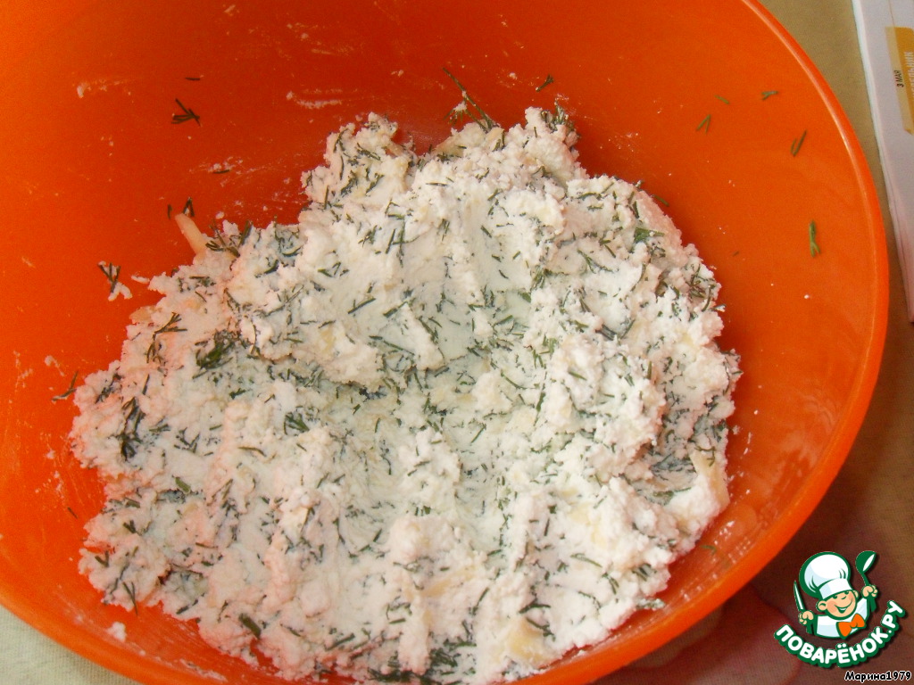 Сыр натираем на крупной терке. Половину сыра смешиваем с творогом и мелконарезанным укропом.