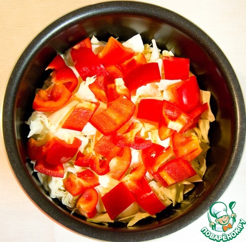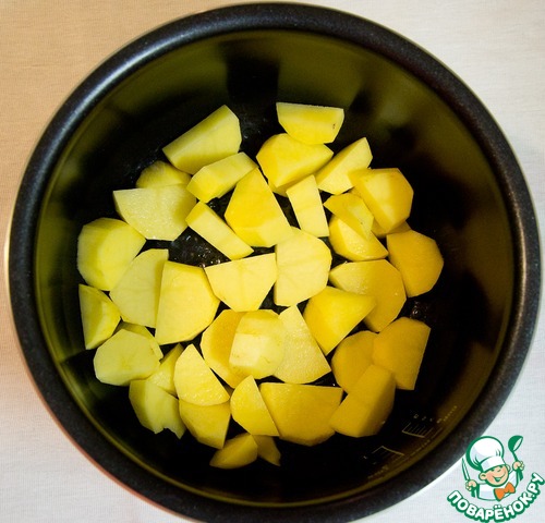 Выкладываем слоями крупно порезанные овощи. Каждый слой слегка присаливаем. Картофель.