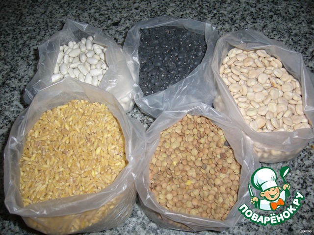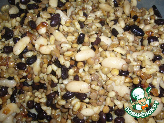 Пшеницу, фасоль чёрную, чечевицу, нут (у меня не было, поэтому я заменила его на белую фасоль) замочить на 1,5-2 часа и отварить до готовности.