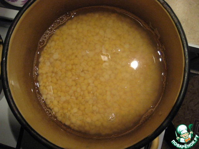 Т. к. в наших краях не водится горох компании "Мистраль", не требующий замачивания, то я использовала обычный и действовала по старинке (т. е. промыла и замочила на ночь в холодной воде).