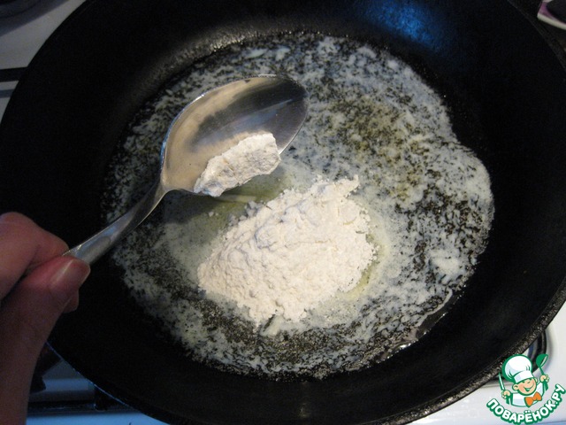 Готовим соус. Растапливаем сливочное масло и обжариваем в нем до кремового цвета муку.